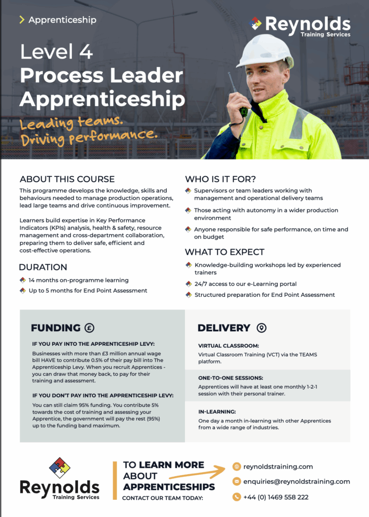 Level 4 Process Leader Apprenticeship equips Process Leaders with the knowledge, skills and behaviours needed to manage production operations, lead large teams and drive continuous improvement. Learners gain expertise in Key Performance Indicators (KPI) analysis, problem solving, health & safety, resource management and cross-department collaboration, preparing them to deliver safe, efficient and cost-effective operations.